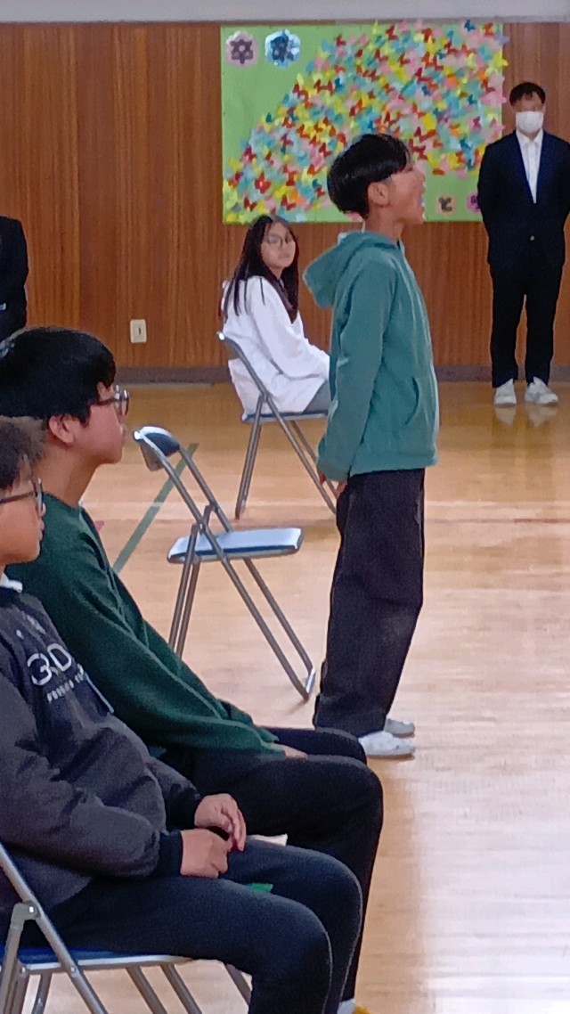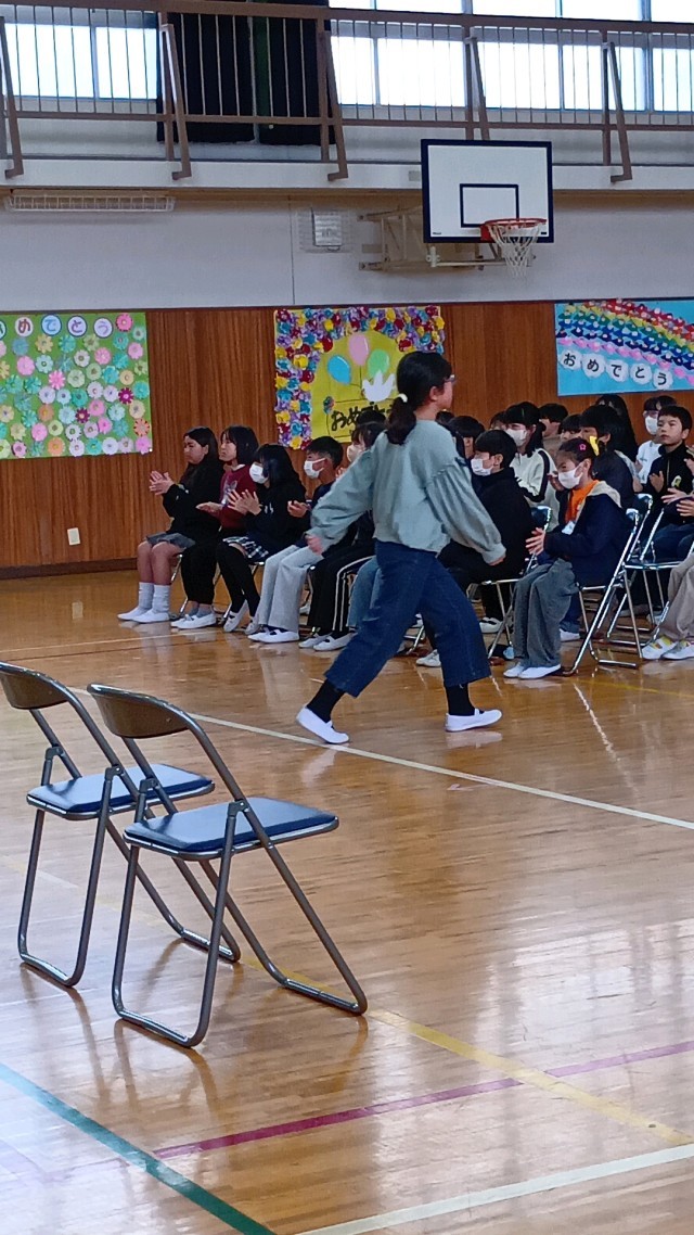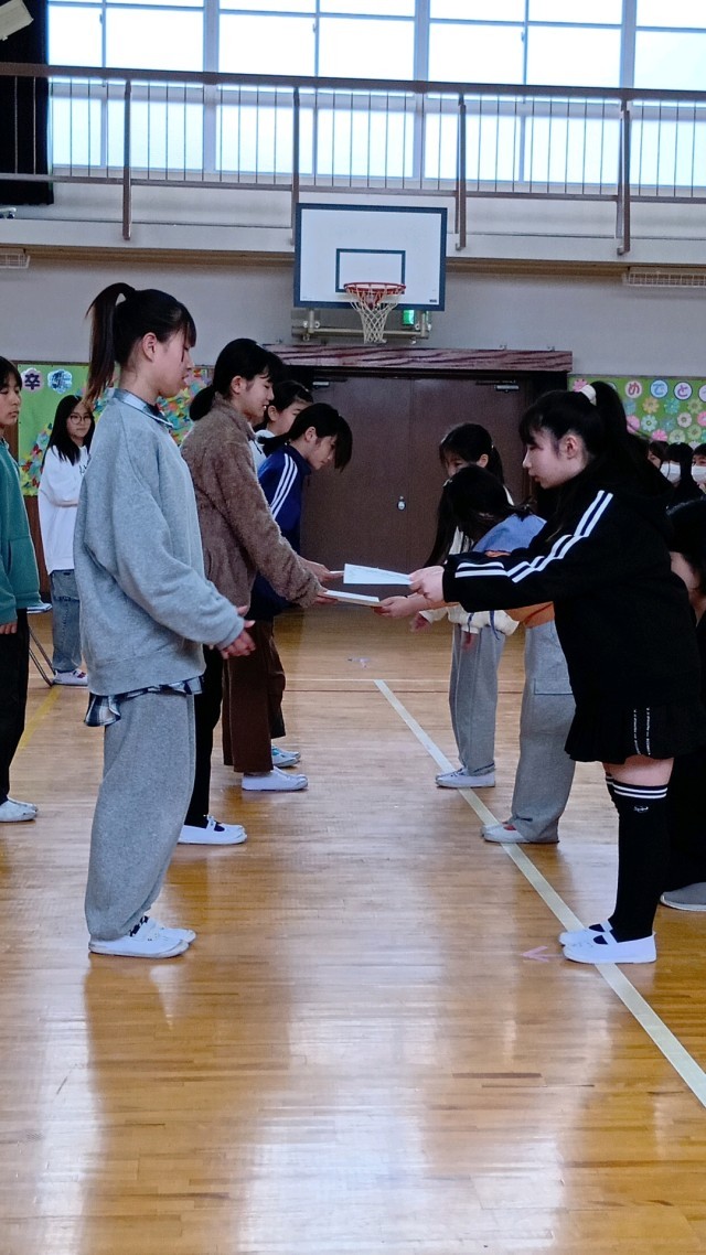 校歌を歌い、5年生から感謝状の贈呈。そして、言葉と歌を贈ります。