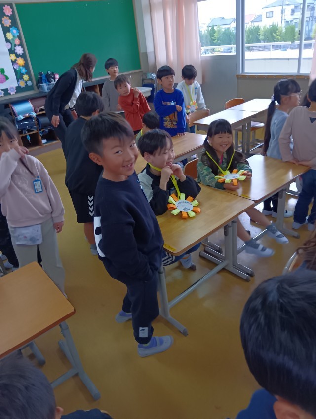 対面式が始まる前、教室では、2年生から1年生にメダルのプレゼントが贈られました。