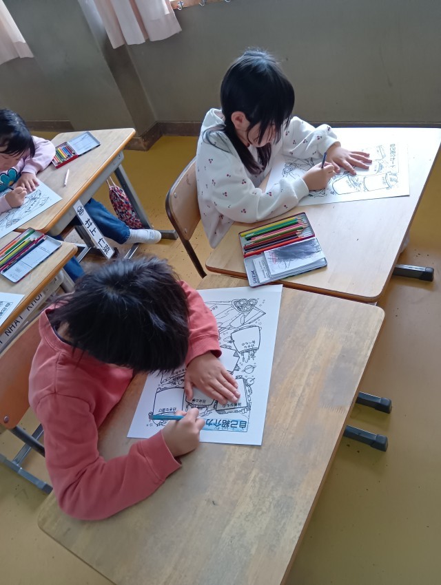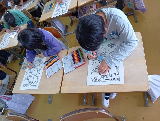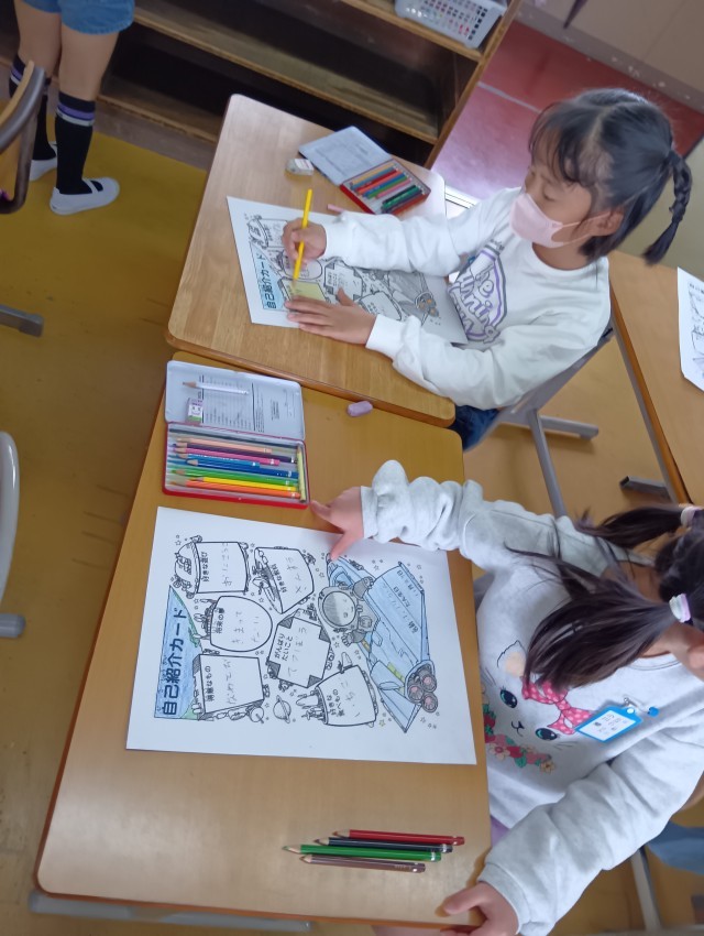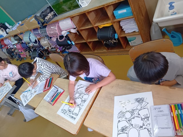 色鉛筆でかわいく、かっこよく色を塗っています。