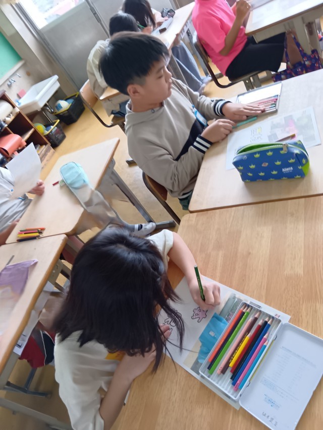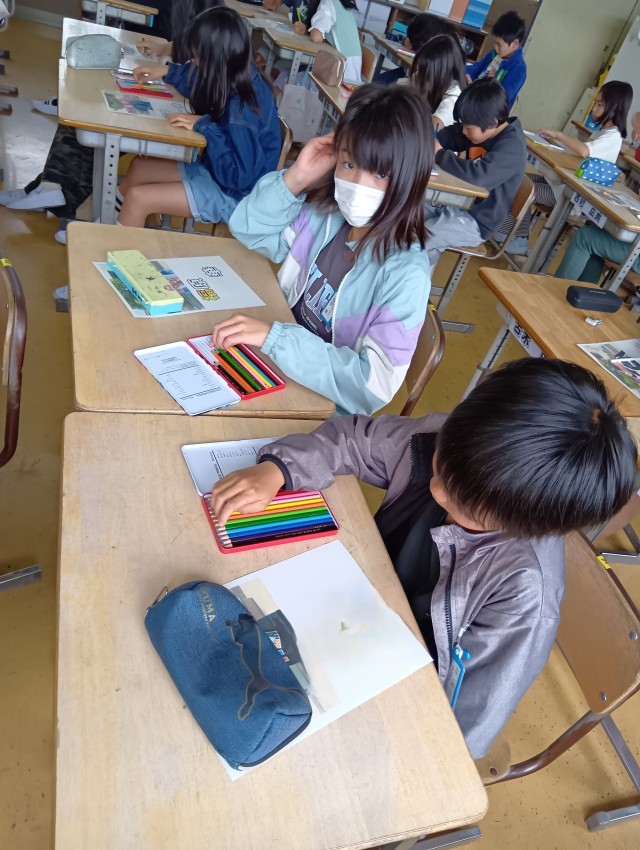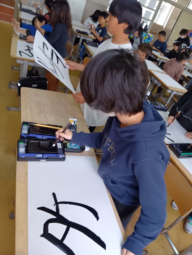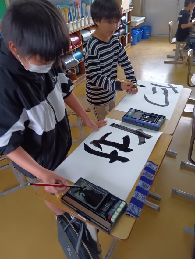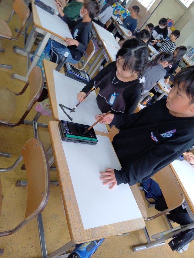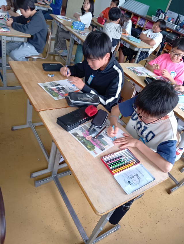 5年生は、図工で自分の名前をデザインしているところです。