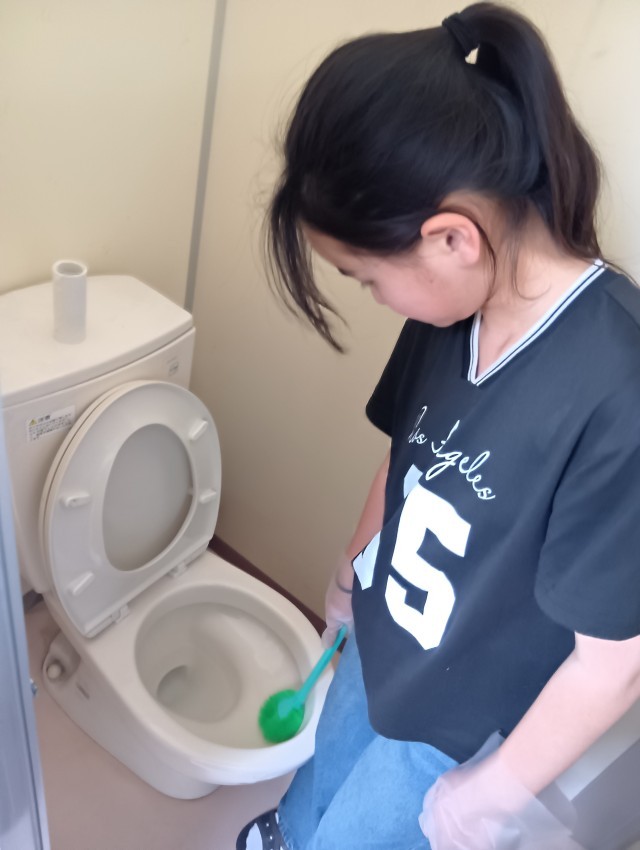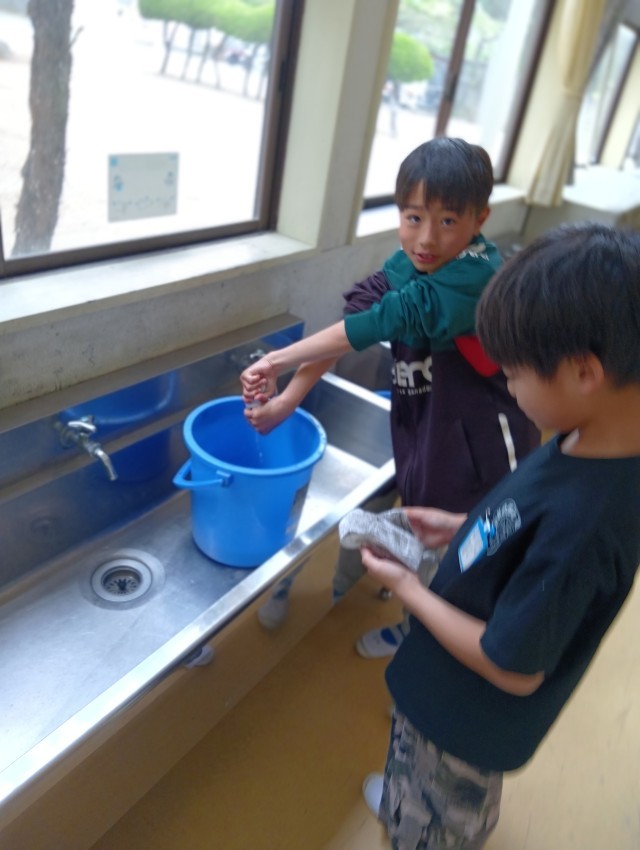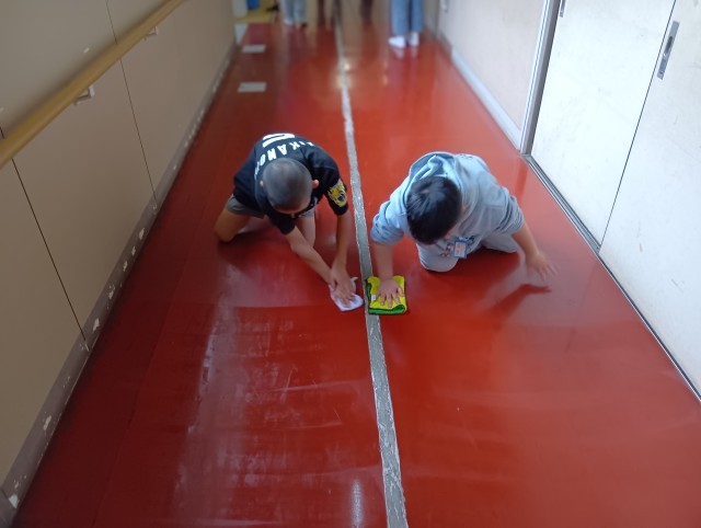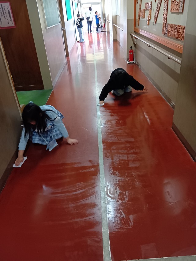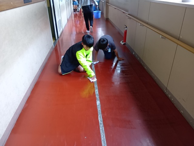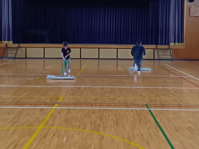 体育館掃除や職員室前の廊下、階段、トイレ掃除に初めて挑戦する人もいました。