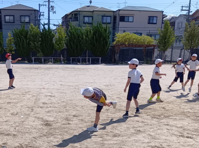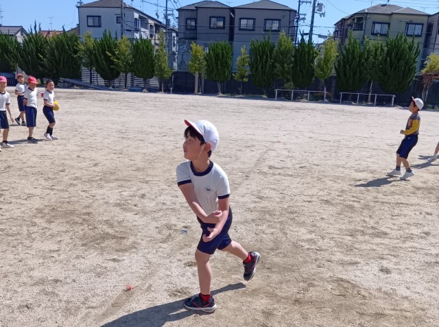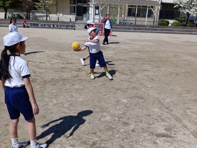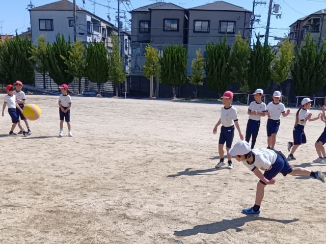 運動場では、青空の下でドジボールです。なかなか迫力のある投げ合いが繰り広げられていました。