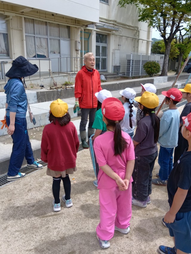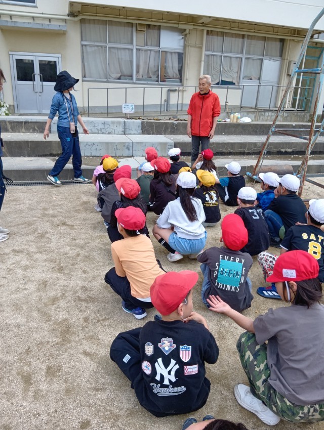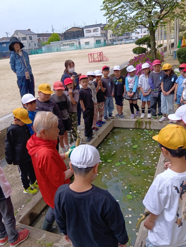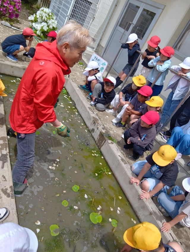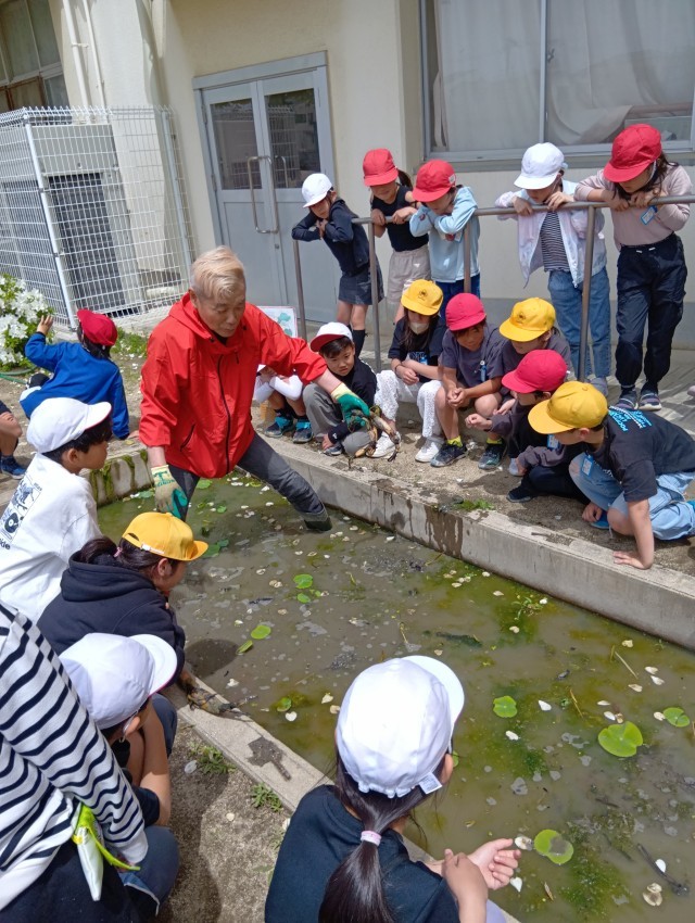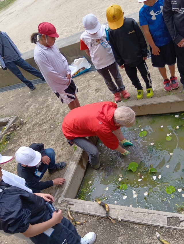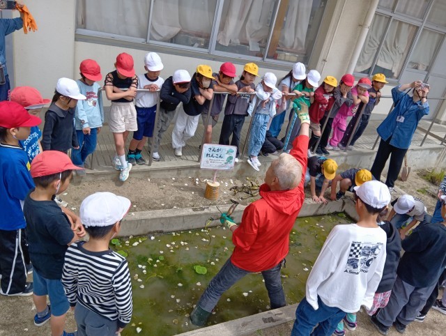 3年生は、今年もれんこん農家の”ぼんちゃん”さんに来ていただいて、れんこんの苗を植えるところを見学しました。
