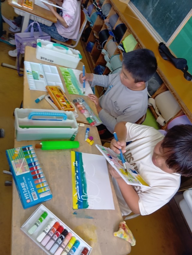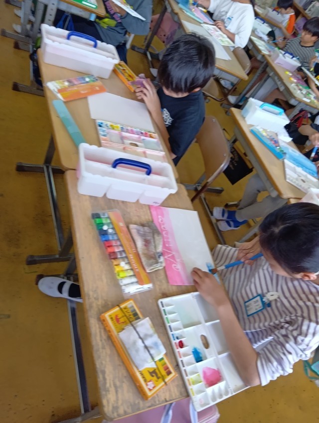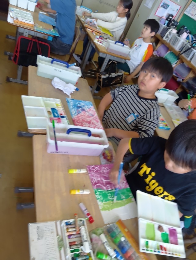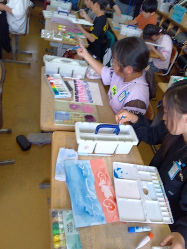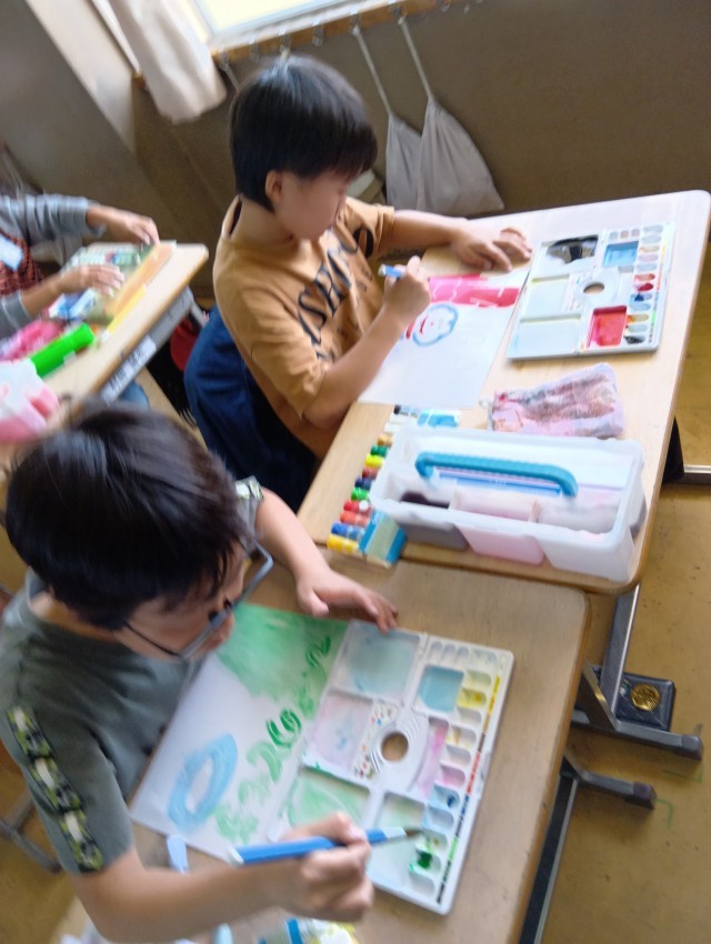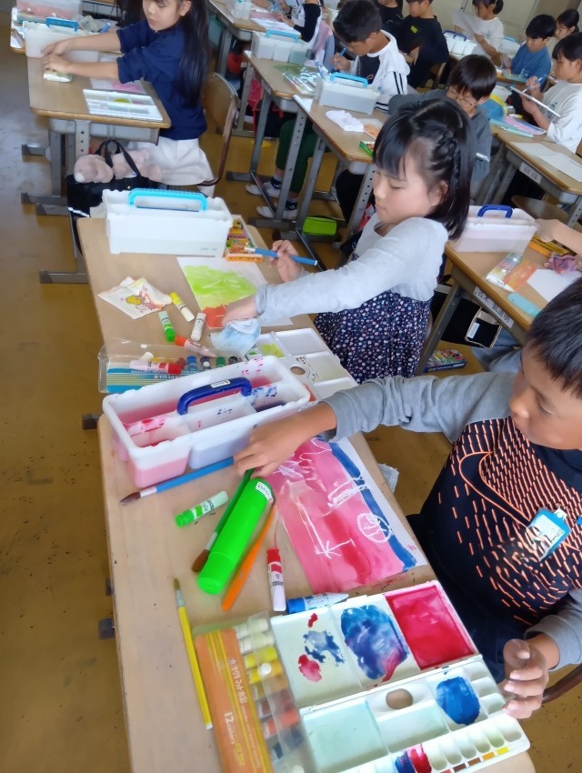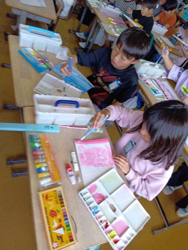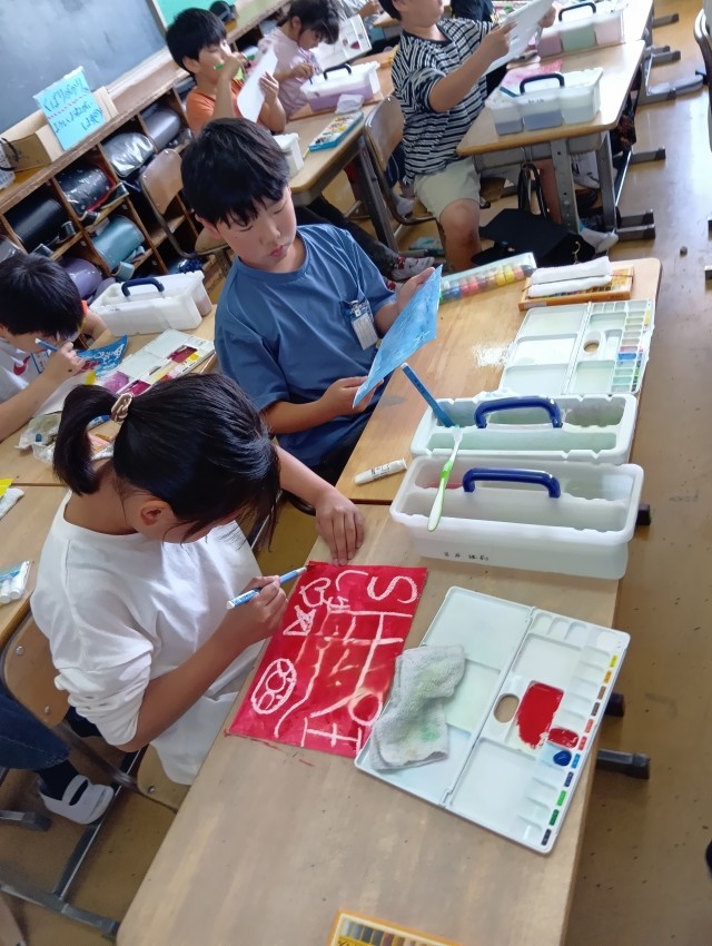4年生の図工は、絵の具を塗ると、白く文字や絵が浮かび上がってきました。