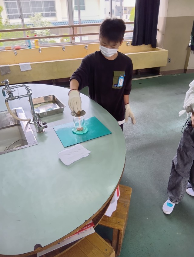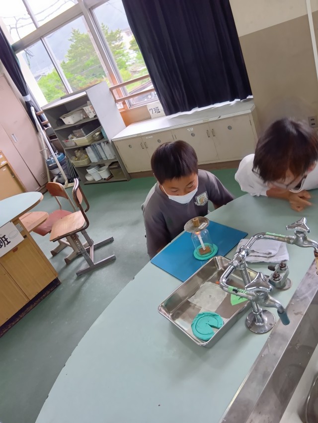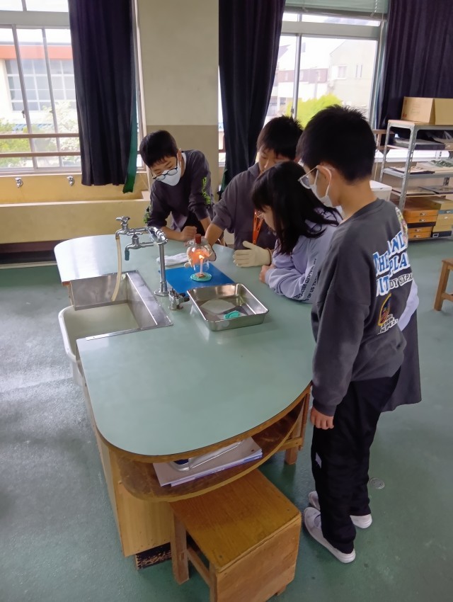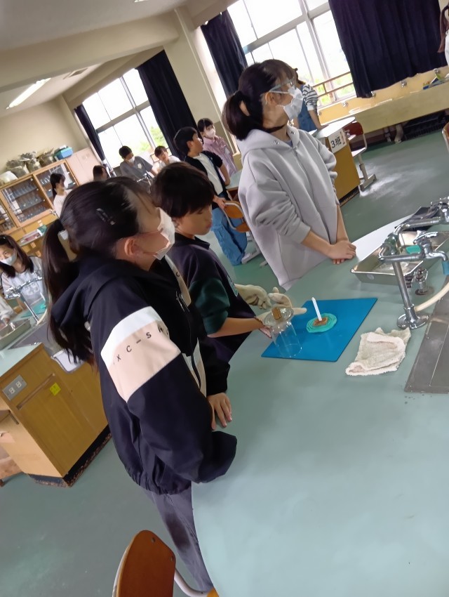 6年生は、理科室でろうそくを使った実験です。