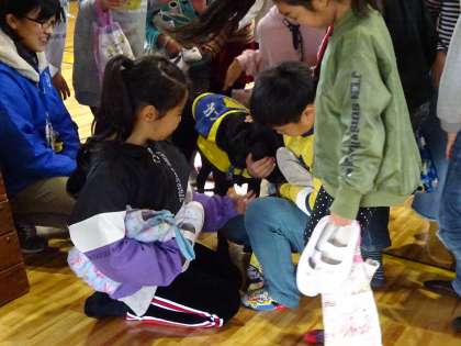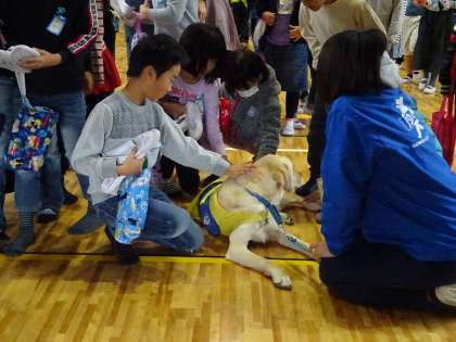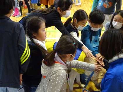 本校を訪れてくれていた氷野小学校の3年生を送り出し、会場を出る際に、介助犬の「ラルフ」「ジゼル」と触れ合う機会がありました。