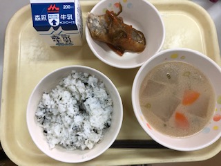 今日のメニューは、青菜わかめごはん・さつま汁・魚のやさいソース・牛乳でした。
