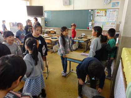 教室の床も、きれいに拭きます。重い机は二人がかりで。