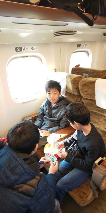 新幹線は新大阪駅を定刻に発車しました。早速カードゲームなどで楽しんでいます。
