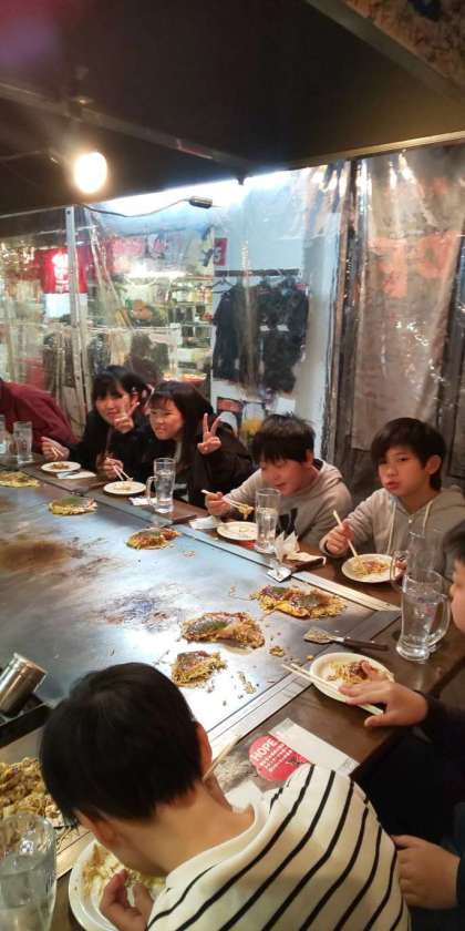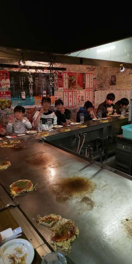 6店に分かれて、お昼ごはんに広島お好み焼きをいただきました。新幹線の中でおやつを食べたあとでしたが、美味しいお好み焼きをほおばっていました!