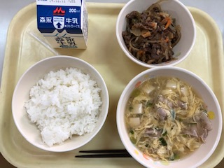 今日のメニューは、ごはん・中華風たまごスープ・チャプチェ・牛乳でした。