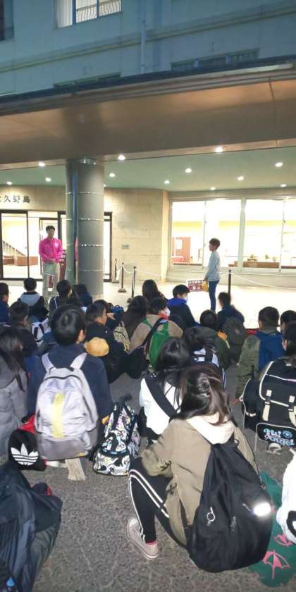 休暇村 大久野島に到着しました。開村式です。休暇村の方のご説明を聞いています。