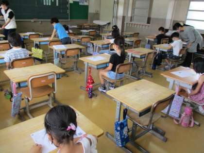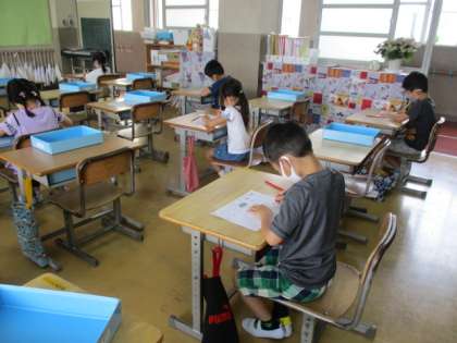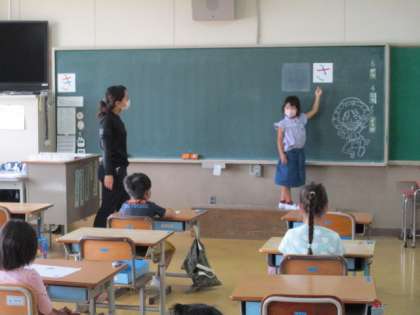 1年生が黒板の前で「ここにきをつけてかくといいです。」と発表していました。今日も背筋をピンと伸ばしていい姿勢です。