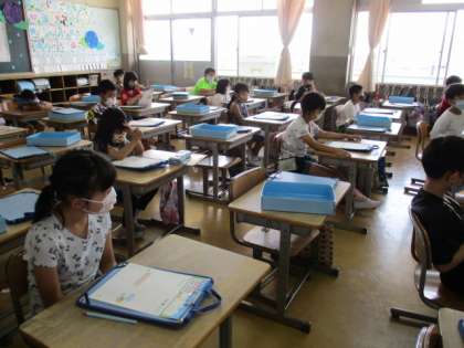 今から、2年生はミニトマトの観察に行くようです。先生の説明を聞いています。