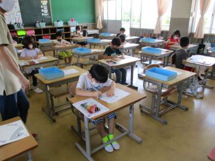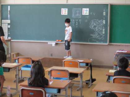 「『ほ』のじをかくときにきをつけるところは、ここです。」1年生が黒板の前でポイントを示していました。