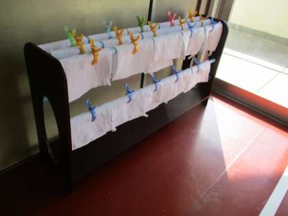 また、子どもたちが掃除の際に、自分たちの使った雑巾をきちんと整えて干すことがてきるように、校務員さんが手作りで雑巾がけを作ってくださいました。