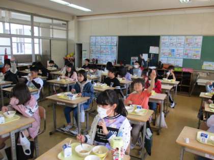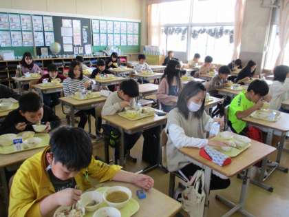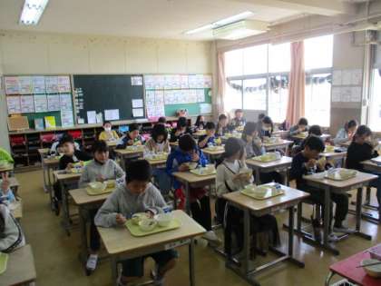 5年1組・5年2組・5年3組の給食風景です。お替りも立たずに、黙って手を挙げると、先生がよそいに行きます。