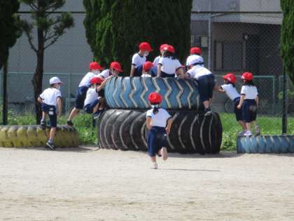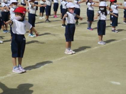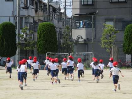 1年生の体育の時間です。並ぶのもだいぶ上手になってきました。校庭の端まで走っていき、元の列に並ぶ練習もしていました。