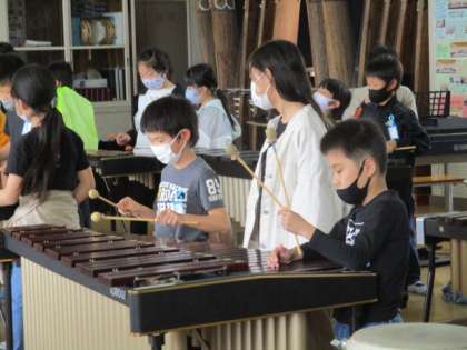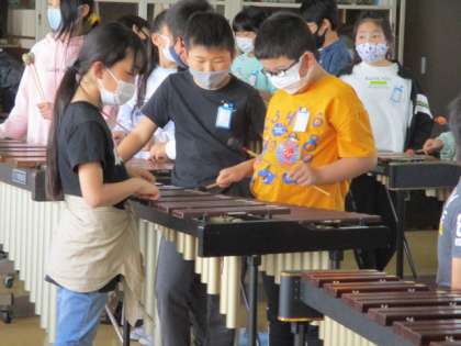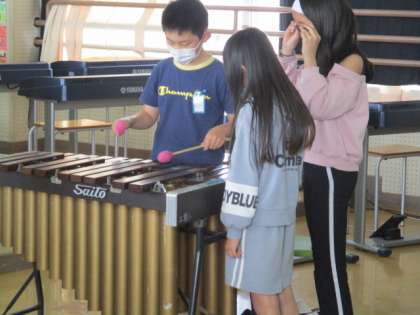 4年生の音楽は、今年も北川先生に教えてもらっています。3人1組になって木琴で『陽気な船長』の練習をしていました。横で見ている子が上手にアドバイスしています。