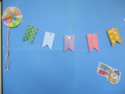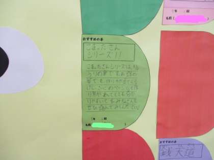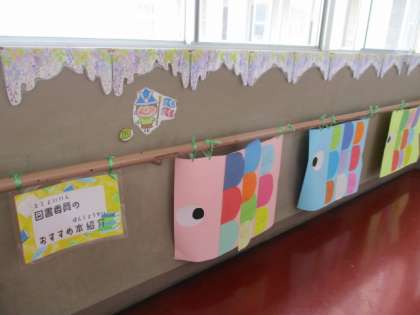 学校図書館前の廊下には、『図書委員のおすすめ本』がこいのぼりのウロコに記されています。