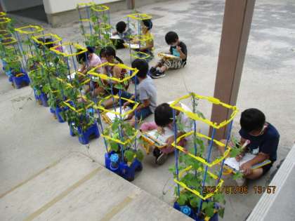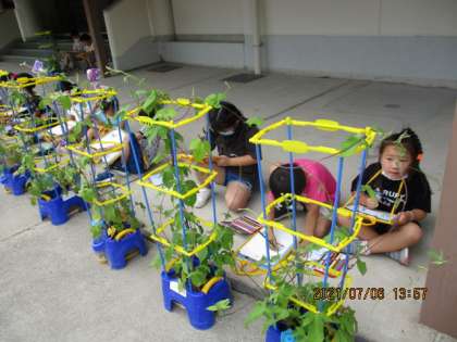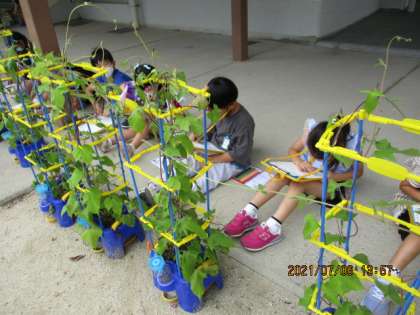 1年生のアサガオの観察タイム。大きくなったアサガオを見て、とても嬉しそうです。