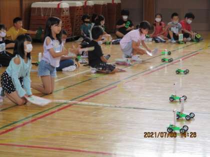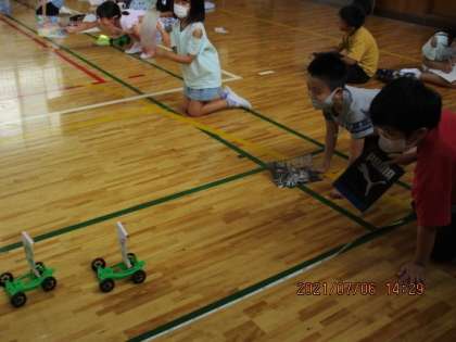3年生の理科の時間です。風の力のはたらきを、動く車をつかって実験していました。強い風のとき、弱い風のとき、それぞれの走った距離をはかっていました。