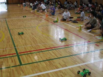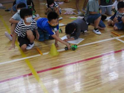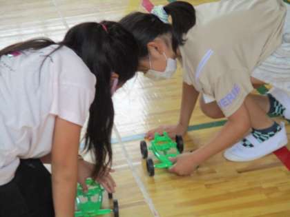 先日は、3年生の理科の実験のようすをお伝えしましたが、今日は、前回の「風の力」ではなく、「ゴムの力」での実験です。体育館で3年合同で行いました。ゴムを5cmのばした場合、10cmのばした場合、15cmのばした場合を計測するのですが、みんな順番にサッサと実験していったので、20cmのばした場合も測ることができました。