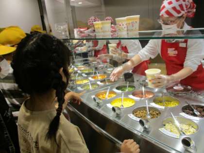カップに麺を入れ、好きなスープと具材を選びます。具材は、好きなものを4種類チョイスすることができました。