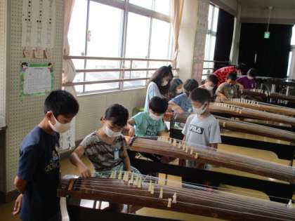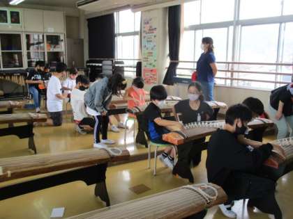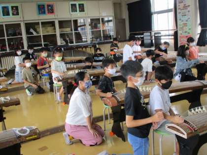 6年生が3年生にお箏の弾き方を教えてくれました。2時間目は、6年2組の子どもたちが半分に分かれて、3年1組の子どもたちをほぼ1対1で教えてくれました。