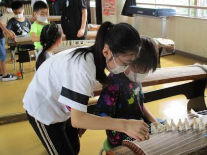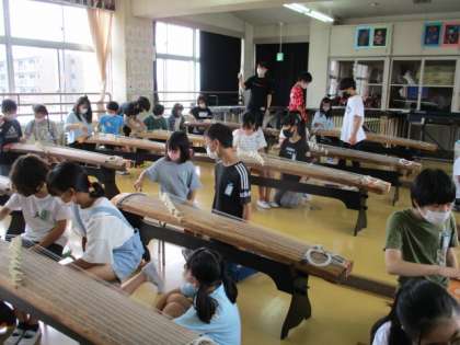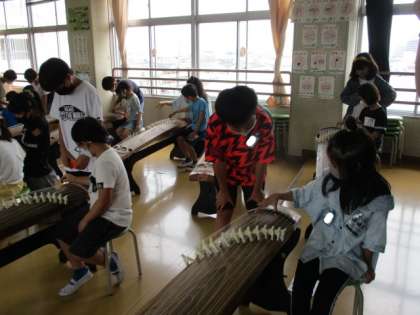 3年生にとっては初めて触る楽器ですが、6年生が教えてくれたとおりにやってみると、それなりに音が出て嬉しそうです。