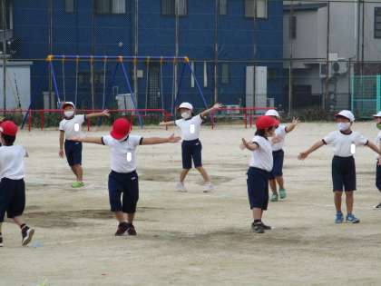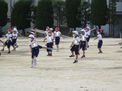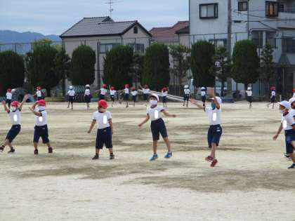 1年生が運動場で練習しているところです。今日は、入場するところから練習していました。この前まで友だちに「こっち!こっち!」と教えてもらっていた子も、自分の場所を覚えてサッと移動できるようになってきました。