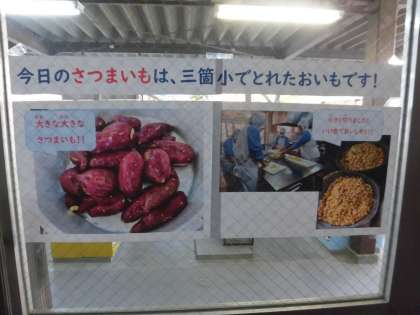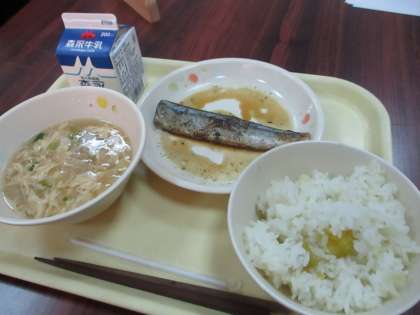 今日の給食のメニューは「さつまいもごはん・さんまのかおりに・かきたまじる・牛乳」です。さつまいもごはんのお芋には、先日、三箇小の畑で1年生が収穫したさつまいもが使われています。