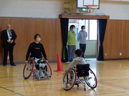 両手の力加減が難しく、まっすぐ進むには比較的うまくできていましたが、バックがなかなかうまくいかずなかなかたどりつかない子や途中で一回転してしまう子も・・・。網本さんは体育館を自由に回り子どもたちにやさしくアドバイスを送ってくださっていました。