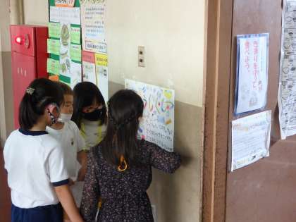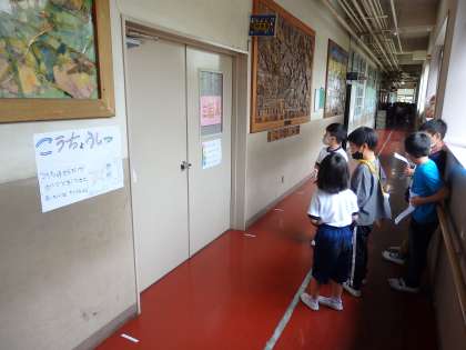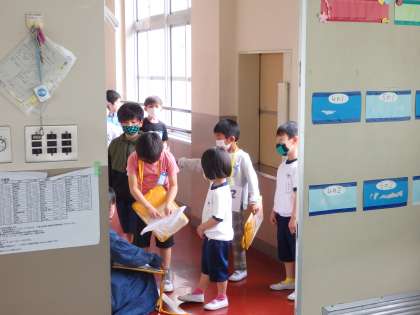 2時間目に1年生をつれて2年生が学校を案内しました。