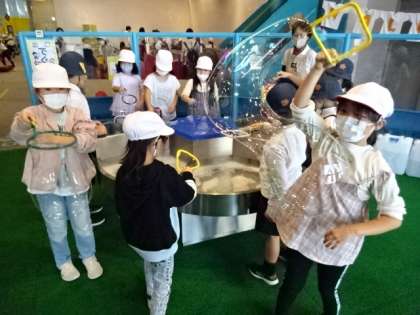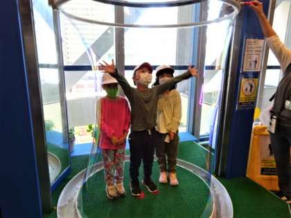 大きなシャボン玉をつくったり、シャボン玉の中に入ったり、日頃できない体験ができました。大阪の自然を観察するコーナーもありました。