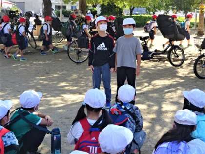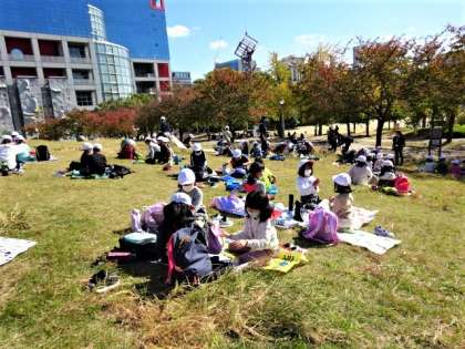 いっぱい活動した後は、楽しみにしていたお弁当タイムです。キッズプラザの裏の公園で、代表のお友だちのお弁当を食べる時の注意を聞いてから、グループで食べました。