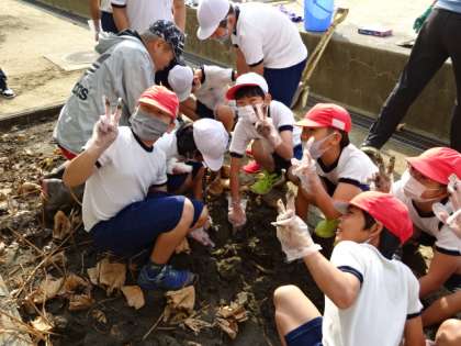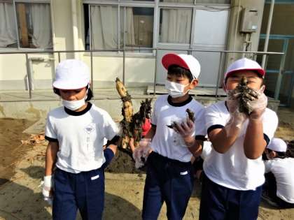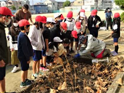 11月4日(金)、今日は秋晴れのもと、4年生が学校で栽培してきたレンコンを掘りました。昨年から花壇をレンコン畑に変えて、レンコン農家の方のご指導のもと1年でレンコンが実りました。