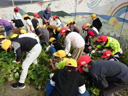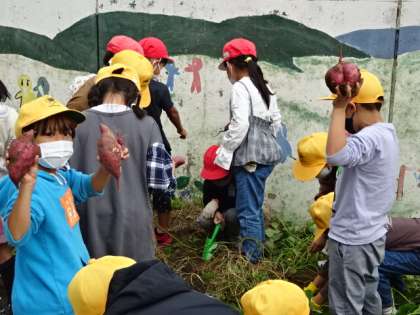 みんなでサツマイモの葉っぱやつるを取り除きながら、いろいろなかたちの、大小のサツマイモが収穫できてうれしかったです。