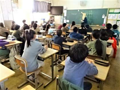 5年生は外国語の学習で、道案内に使うような「まっすぐ進む」「右に曲がる」「左に曲がる」の英語の言い方を習いました。英語指導助手のレイチェル先生と一緒に、ゲームのようにマス目をゴールまで進んでいくときに、子どもたちが進み方を英語で発音しました。