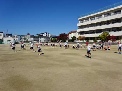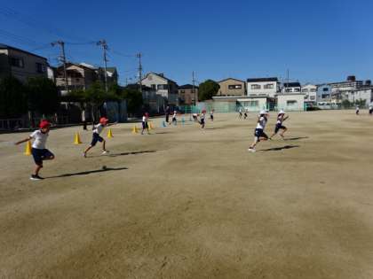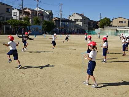 2年生は合同体育でなわとびの駆け足跳びの練習をしています。すばやくなわを回して、ポールを回って戻ってきます。お手本の跳び方を見せてくれた子もとても軽やかに跳んでいくのでびっくりしました。