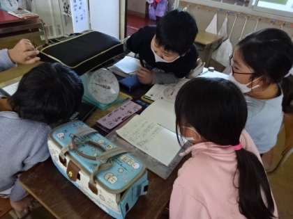 算数では重さの学習で、はかりを使って身近な重いものを測ってみました。ランドセルは、はかりの針が一周回って2kgを超えました。