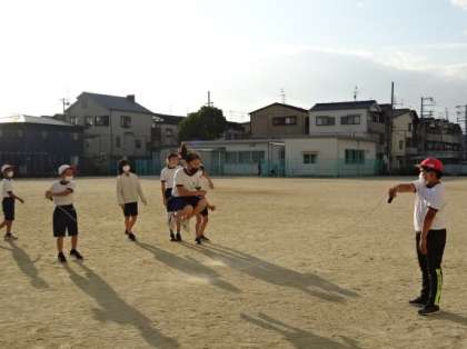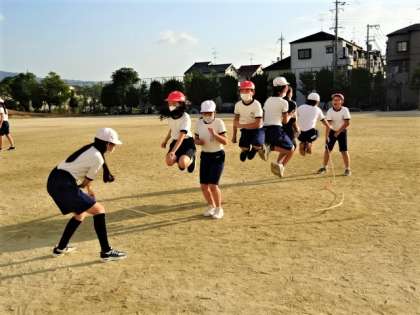 5年生が体育で大縄跳びをしています。グループごとに技を決めて、みんなで挑戦しています。とても楽しそうです。
