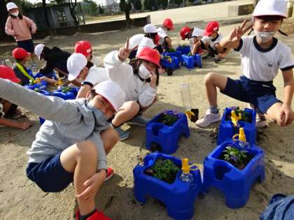 裏庭はポカポカ陽気で、みんな丁寧に植木鉢の土に穴を作って、そこに一人一株のお花を植えました。そしてチューリップの球根も2個ずつ植えて、土のおふとんをかけました。