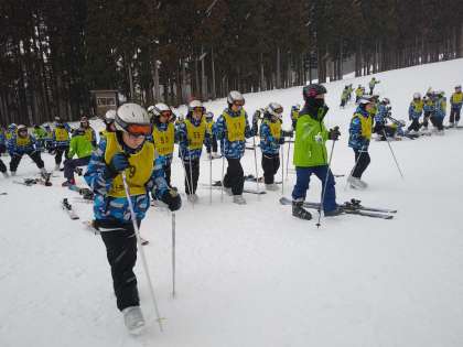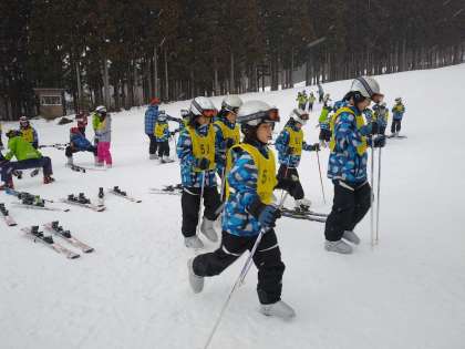 粉雪が降っていますが、風はなくスキー学習には最適です。まずはスキー板の付け方や歩き方の練習をしました。