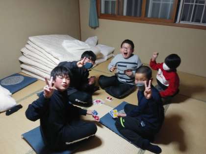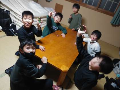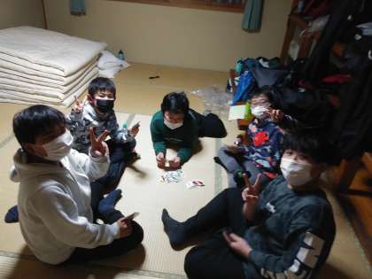 雪遊びも終えて、着替えたあと、夕食までの時間を部屋でくつろいでいます。みんな楽しそうです。