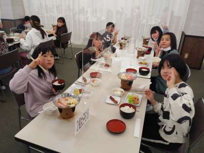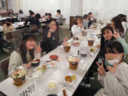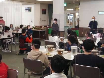 待ちに待った夕食です。今日はたくさん活動して、おなかもすいたと思います。いただきますの挨拶のあと、おいしいごちそうをいただきました。