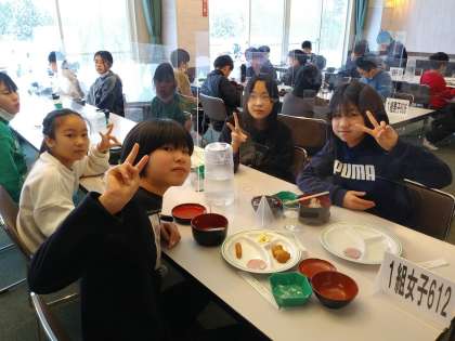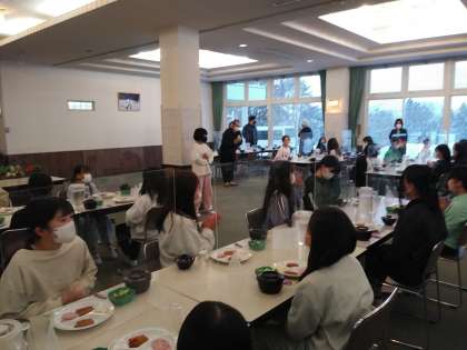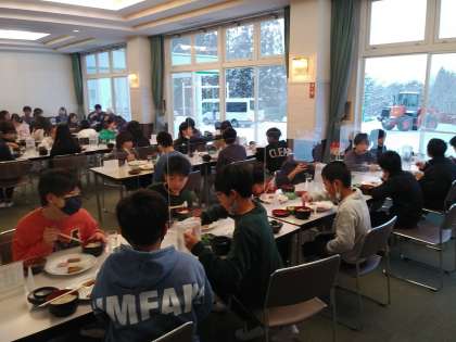 もうすぐ朝食を食べ終わります。子どもたちはみんな元気です。食堂の窓からは除雪車の作業の様子が見れました。空も晴れてきました。これからスキー準備をはじめます。