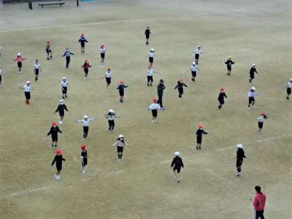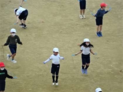 2年生は体育でなわとび練習をしています。自分の得意な跳び方で、どれぐらい長く跳んでいられるか挑戦しました。