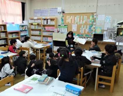 図書の時間には、学校図書館司書の先生が絵本の読み聞かせをしてくれました。十二支に「ねこ」が入らないわけのお話でした。