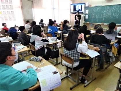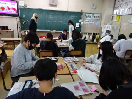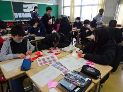 外国語科の学習では、バレンタインデーにちなんで折り紙でハートを作り、そこにメッセージを英語で書く学習をしました。
